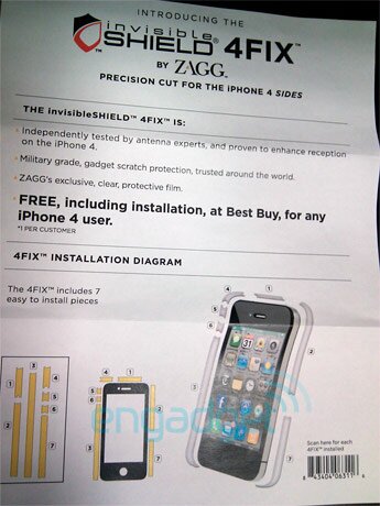Веб-сайт Engadget сообщает о том, что в магазинах американской розничной сети Best Buy покупателям iPhone 4 бесплатно предоставляют наборы ZAGG invisibleSHIELD 4FIX, включающие в себя выкройки из пленки с адгезивным слоем, сделанные по размерам бокового металлического обода нового телефона Apple.